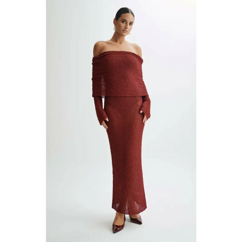 Meshki Marisol Off Shoulder Boucle Maxi Dress – Plum