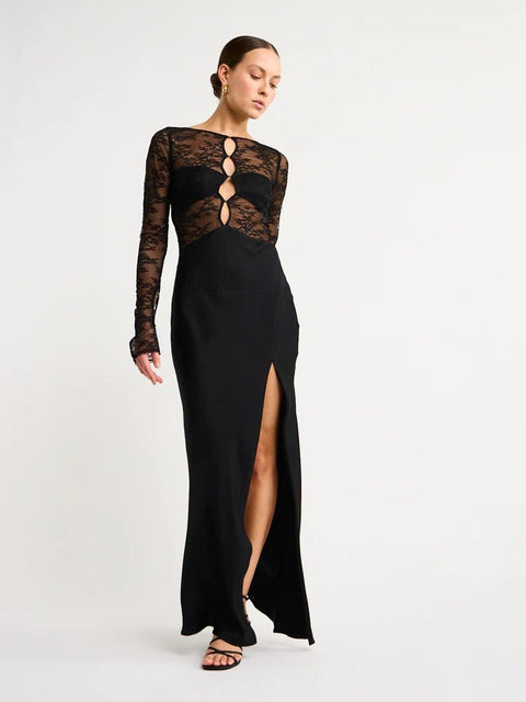 The Nola Lace Long Sleeve Maxi Dress is an alluring style featuring contrast stretch lace and a statement open, round cut out back. The dress is further complimented with a graceful leg split and a built in bralette. Metal hook and ball closures adorn the sleeves, as well as the centre front and back openings. Designed for to be fitted at the waist and bust before falling into a relaxed, straight skirt. Dress is accessed through invisible zip at back and hook and ball closures. Available in size 10, true to size.