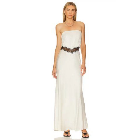 Designed to be fitted at bust and hips, slightly relaxed through skirt. Dress is accessed through invisible zip at back, strapless bra friendly. Fabric offers no stretch to the fit.