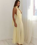 With romance in mind, meet Antonia. The perfect balance between flirty & sweet. Crafted from a luxurious and delicate georgette in a soft yellow. Her elegant design drapes over the body and cinches the waist with pleated detailing to flatter and accentuate the feminine curve. Finely finished with a statement leg split for a stand out touch. Antonia is a romantic classic made to last for years to come.