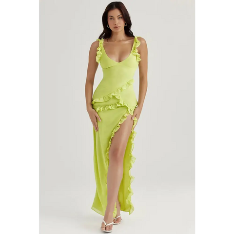 House Of CB Pixie Ruffled Split Maxi Dress Lime Green Size M