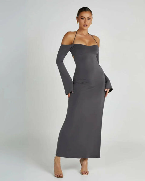 Meshki Slinky Off Shoulder Maxi Dress in Charcoal