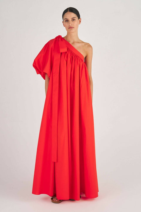 The Oroton One Shoulder Dress in True Red is the epitome of elegance and style. In pure cotton poplin in a bold True Red colourway, this glamorous statement dress is gathered from the neckline, before falling into a full-length, feminine A-line skirt. An elastic band at the back of the neckline, full exaggerated single sleeve and optional belt make The Oroton One Shoulder Dress an easy-to-wear, head-turning style, finished with high side vents, and pockets.