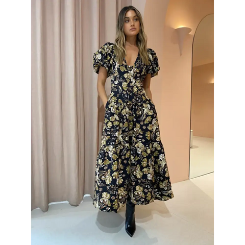 Shona Joy Palermo Plunged Short Sleeve Midi Dress in Black/Multi