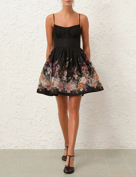 Zimmermann Natura Ruched Mini Dress in Black Wild Flowers