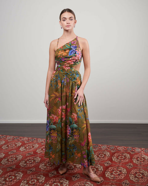 Zimmermann Tropicana Asymmetric Dress Khaki Floral Size 10, 12